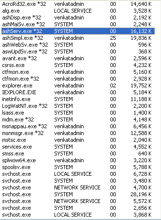 In Windows XP 64, 32 & 64 bit applications run side by side, with the 32 bit legacy application (the new application you wrote yesterday with Win32 API is now called legacy) running on a WOW (Windows on Windows) layer. Notice all the major applications that comes in Windows are now 64-bit, this includes your Explorer and Internet Explorer. Notice in the screenshot below after the application name *32 indicating these are 32-bit applications.