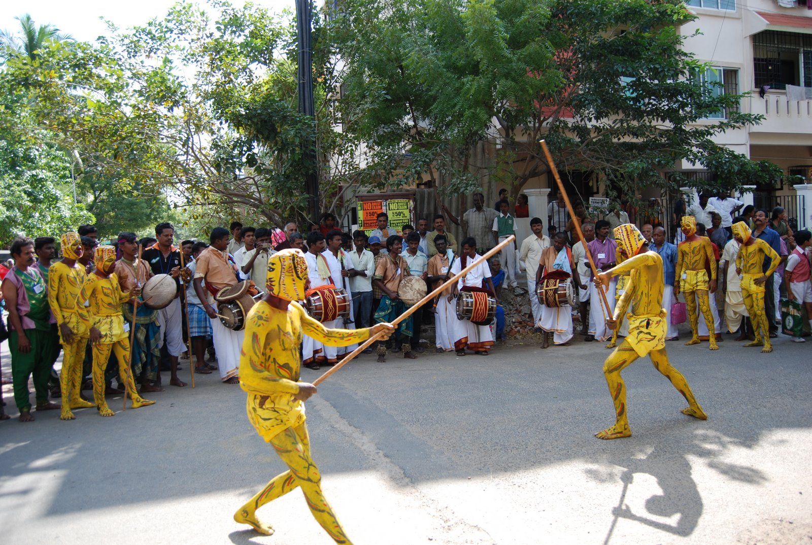மதியம் ஒன்றரை மணியிலிருந்து இரண்டு மணிவரை அருமையான கிராமிய/பாரம்பரிய கலை நிகழ்ச்சிகளை வீட்டின் அருகையில் இலவசமாகக் கண்டுகளித்தோம். தப்பாட்டம், புலி ஆட்டம், கத்தி வித்தை மற்றும் சில கலைகளை அழகாகவும் சுருக்கமாகவும் செய்து காட்டினார்கள். சென்னை நகரத்திலேயே பிறந்து வளர்ந்த நான் இது போன்ற கிராமிய கலை நிகழ்ச்சிகளை இதற்கு முன்பு நேரில் பார்த்ததேயில்லை, சினிமாவில் பார்த்ததோடு சரி. என்னோடு என் மகனும் பார்த்து ரசித்ததைக் கண்டு நான் மகிழ்ந்தேன், என்னைப் போலவே அண்டையயலிலுள்ள மற்ற (அரைக்காற்சட்டை அணிந்த) அப்பாக்களும் தான்.
