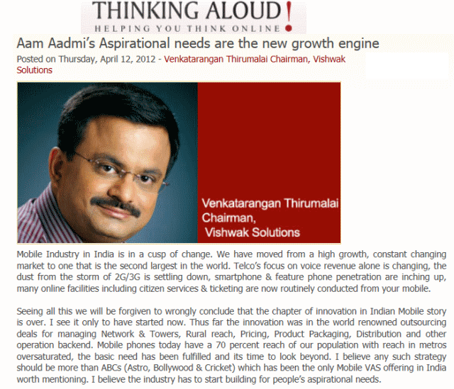 In this month (April 2012) issue of Think Aloud magazine published by Internet & Mobile Association of India (IAMAI) my article has been published. This issue is a Mobile VAS…