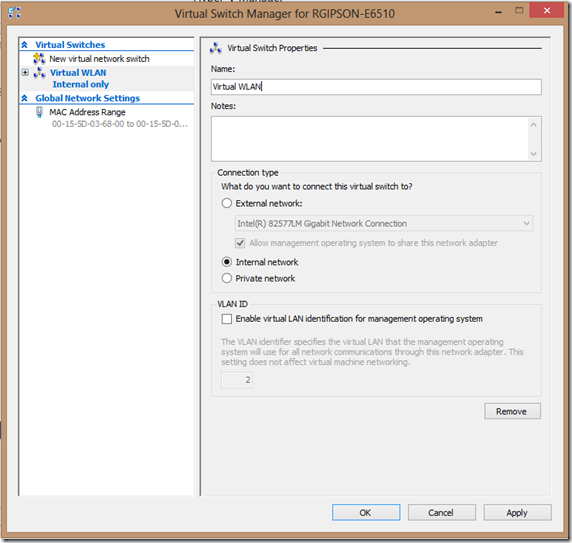 One of the challenges with Hyper-V has been on sharing WiFi Connection that’s present in the Host OS (Windows 8) with the Guest OS. This happens in scenarios like in Hotel room where every device connected to WiFi will be charged or in Corporate environments where WiFi is secured with RADIUS authentication against an Active Directory which prevents you from connecting to network non-domain machines.