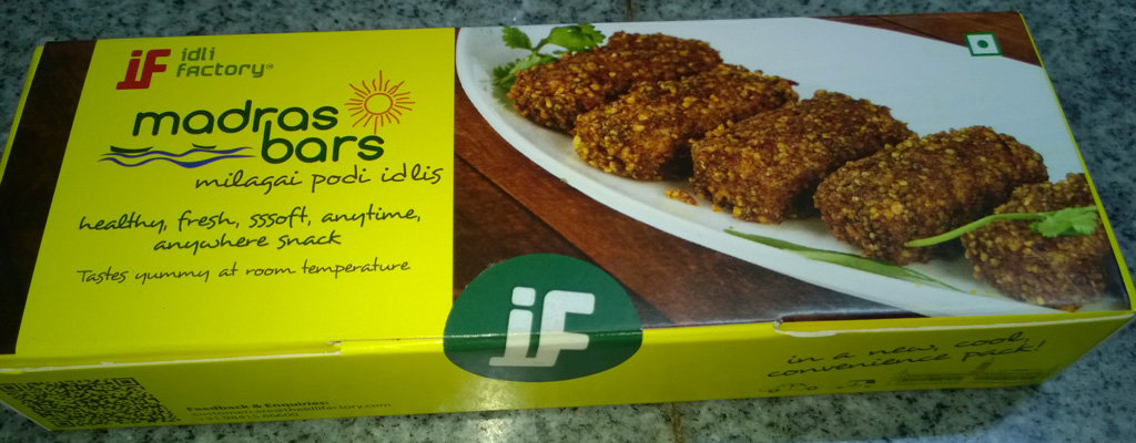 Today while shopping in T.Nagar Brown Tree shop for Dried Figs and Walnuts I saw a packet of The Idli Factory. It was of their Podi Idli (Chilli & Oil smeared on steamed rice Idlis). It was a pack of 6 Bar shaped Idlis costing Rs.50. Each pack comes with a making date and time (mine was 12th October 2014 8AM) and it was good to be eaten within 24 hours from that. Otherwise, they are fresh, no preservatives (with oil and chilli acting as natural preservatives during the day) and is ready to go. You buy it, open the pack, unwrap the butter paper, pick up the bars and eat it – that’s all. Nothing to mix or prepare or re-heat.