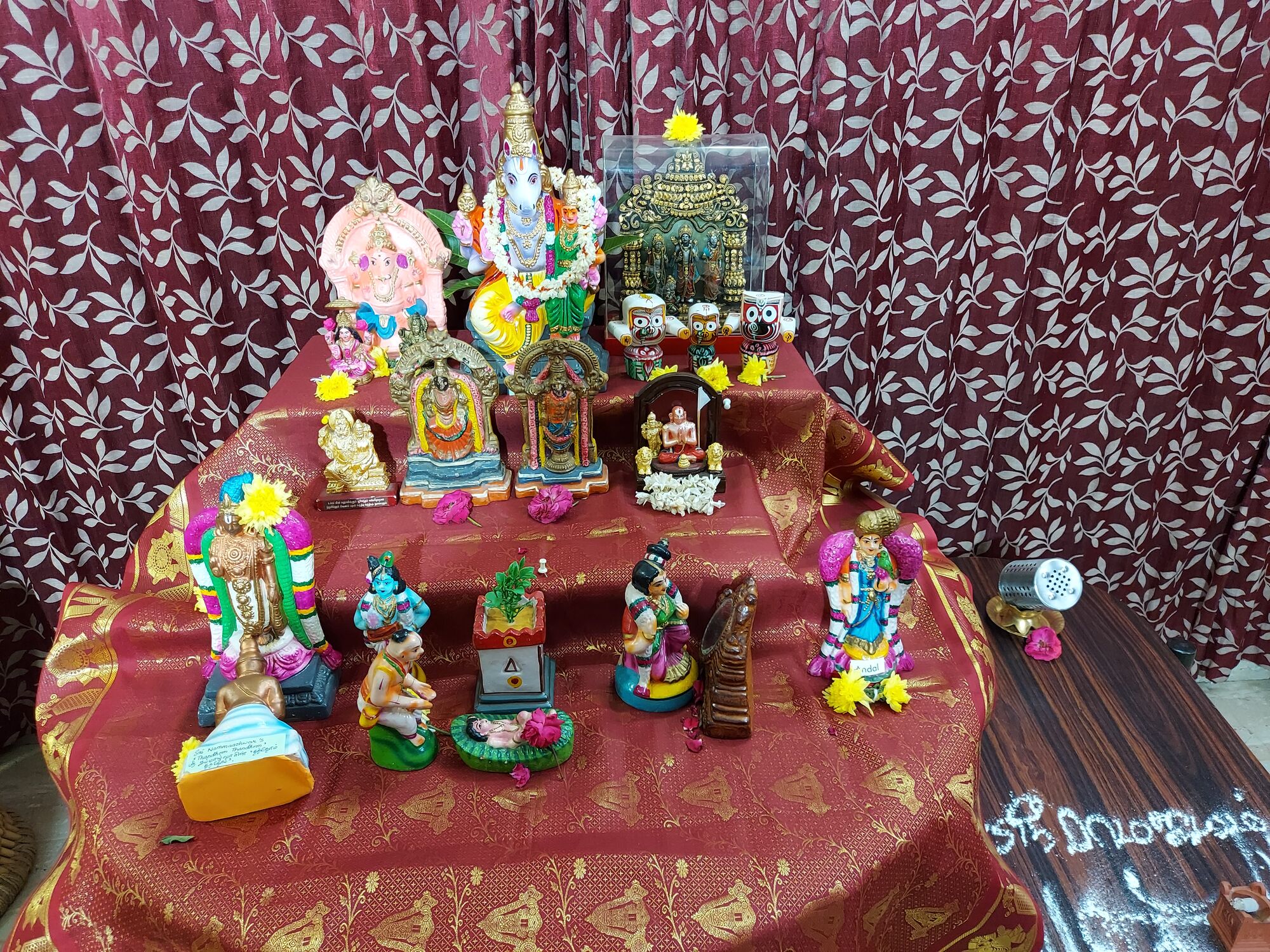 எங்கள் வீட்டில் வருடா வருடம் (2019, 2018), விமர்சையாக, இரண்டு அல்லது மூன்று கொலு அடுக்குகளில், பல படிகளாகக் கொலு வைப்போம். கொரோனா சூழ்நிலையால், என் அம்மாவும் அனுமதித்த காரணத்தால், இந்த ஆண்டு எளிதாக வைத்திருக்கிறோம். ஒரு வட்ட சாப்பிடும் மேசையில், மூன்று மரப் படிகளை வைத்து மிகச் சிறிய அளவிலான கொலு. நண்பர்களை, உற்றார், சுற்றத்தார்களை அழைக்கவில்லை. மன்னிக்கவும்!