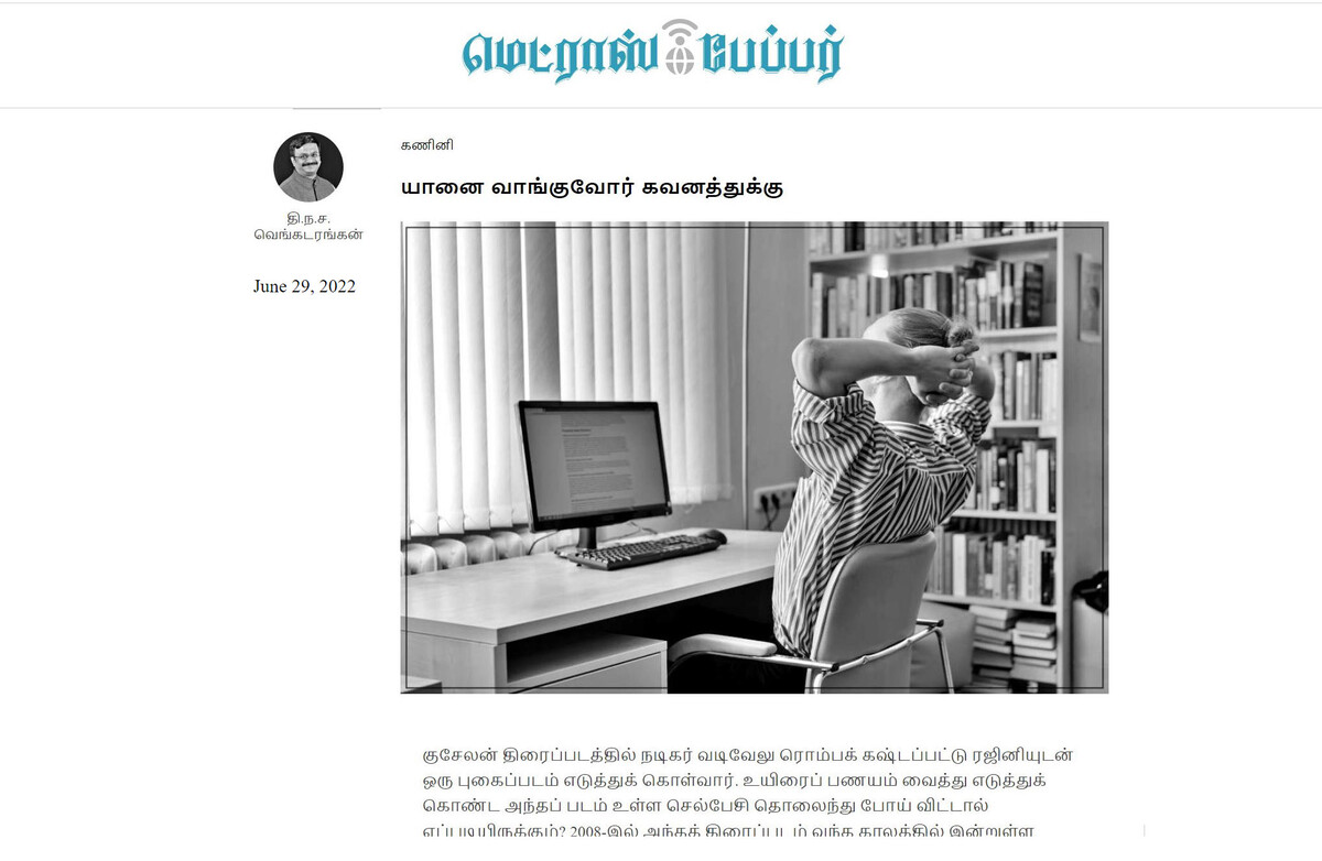 இன்றைய மெட்ராஸ் பேப்பர் இதழில் “யானை வாங்குவோர் கவனத்துக்கு” என்கிற தலைப்பில் என்னுடைய கட்டுரை வெளிவந்திருக்கிறது. இந்தக் கட்டுரையை எழுத எனக்கு வாய்ப்பளித்து, எழுதியதை அவரது மோதிரக்கையால் செம்மைப்படுத்திய நண்பர், பிரபல எழுத்தாளர் திரு பா ராகவன் அவர்களுக்கு எனது மனமார்ந்த…