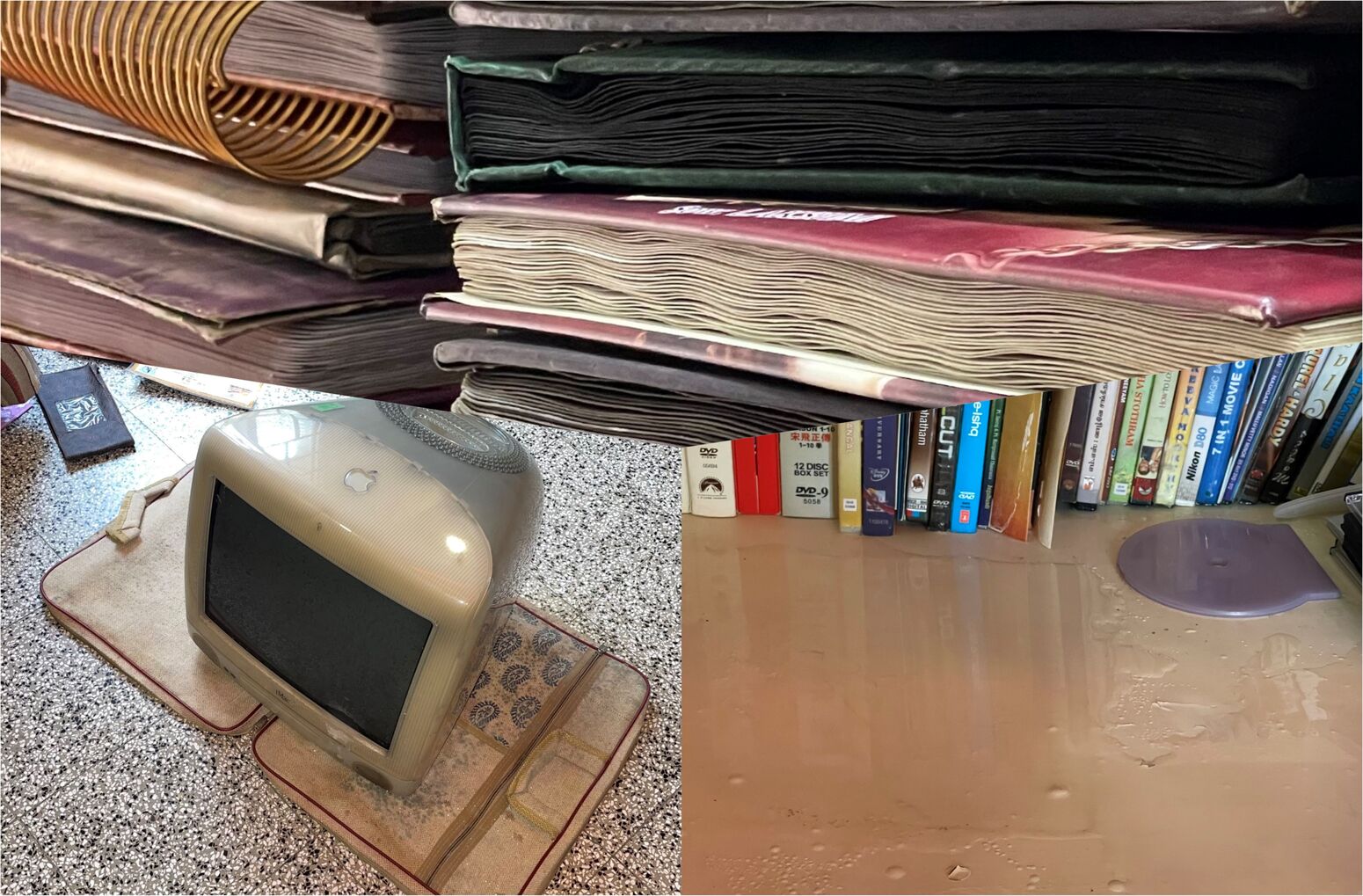 இதோடு பொக்கிஷமாகக் கருதி நான் வைத்திருப்பது, நல்ல நிலையில் இருந்த ஆப்பிள் ஐ-மேக் முதல் பதிப்பு. இதன் கீழேயும் தண்ணீர். இன்னும் இரண்டு நாட்கள் காயவைத்தவுடன் தான் மின்சாரம் செலுத்தி இயக்கிப் பார்க்கப் போகிறேன். ஒன்றும் கேட்டுப் போய் இருக்கக் கூடாது என்று வேண்டிக் கொண்டிருக்கிறேன்.