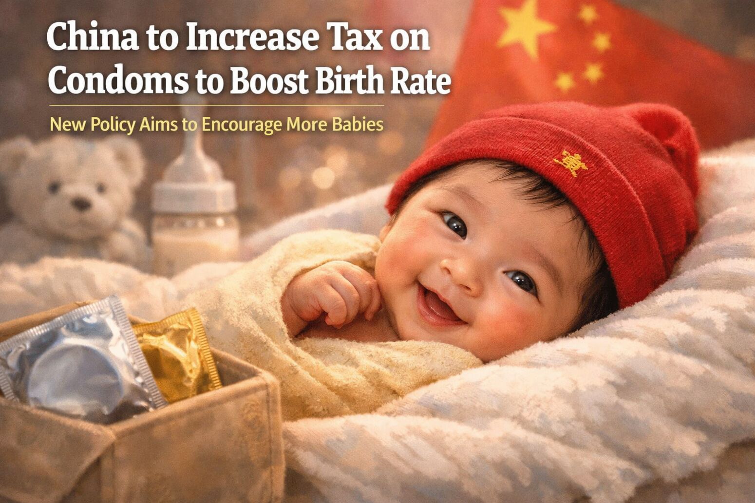 சீனா: கருத்தடை உறைகளுக்கு (Condoms) வரி! பிறப்பு விகிதத்தை அதிகரிக்க முயற்சி. ஜனவரி 1 முதல், கருத்தடை சாதனங்களுக்கு 13% VAT வரி விதிக்கப்படும். இது மக்கள் தொகை பெருக்கத்தை ஊக்குவிப்பதற்கான சீன அரசின் புதிய நடவடிக்கை.