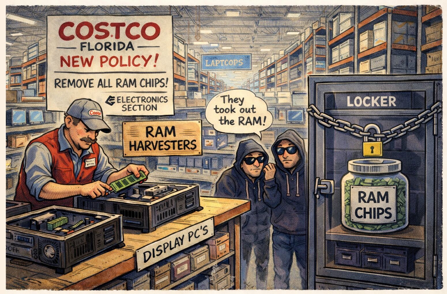 பிளோரிடாவில் இருக்கும் அனைத்துக் காஸ்ட்கோ கடைகளிலும் பார்வைக்கு இருக்கும் கணினிகளிலிருந்து நினைவக (RAM) சிப்புகளையும், என்வீடியா ஜிபியுகளையும் கழற்றிப் பாதுகாப்பாக எடுத்து வைத்துவிட வேண்டும் என்று சொல்லப்பட்டுள்ளது. ஒவ்வொரு காஸ்ட்கோ கடையிலும் சில கணினிகளே பார்வையில் இருக்கும்; மற்றவற்றை ஏணி வைத்து ஏறி எடுக்க வேண்டும். இதெல்லாமே காமிரா கண்காணித்துக் கொண்டிருக்கும். அப்படிப் பாதுகாப்புக் கருதி கழற்றி வைத்தாலும், அமெரிக்கப் பெருநிறுவனங்கள் பொதுவாகப் பயன்படுத்திய இந்தப் பொருள்களை ஏலமெல்லாம் விடமாட்டார்கள்; தூக்கிக் குப்பையில்தான் போடுவார்கள். ஏனென்றால், அதை ஏலம் விடுவதற்கு அவர்களின் தொழிலாளர்களின் கூலி அதிகமாகும் என்பதால்.